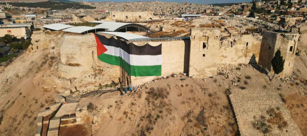 Gaziantep’in sembollerinden olan tarihi Gaziantep Kalesi’ne devasa büyüklükte Filistin bayrağı asıldı. Bayrağın asılma anları ise dron kamerası ile kaydedildi.